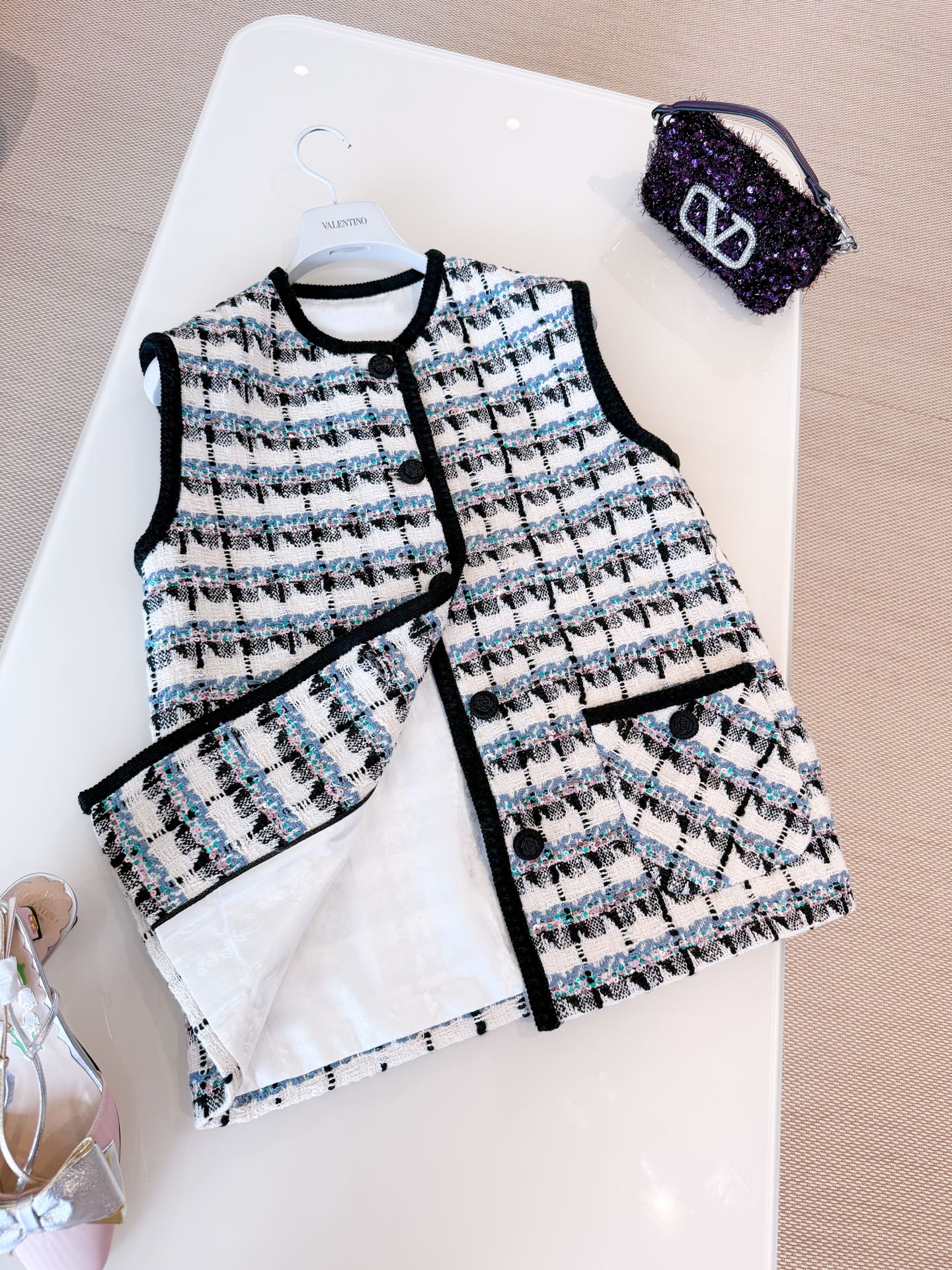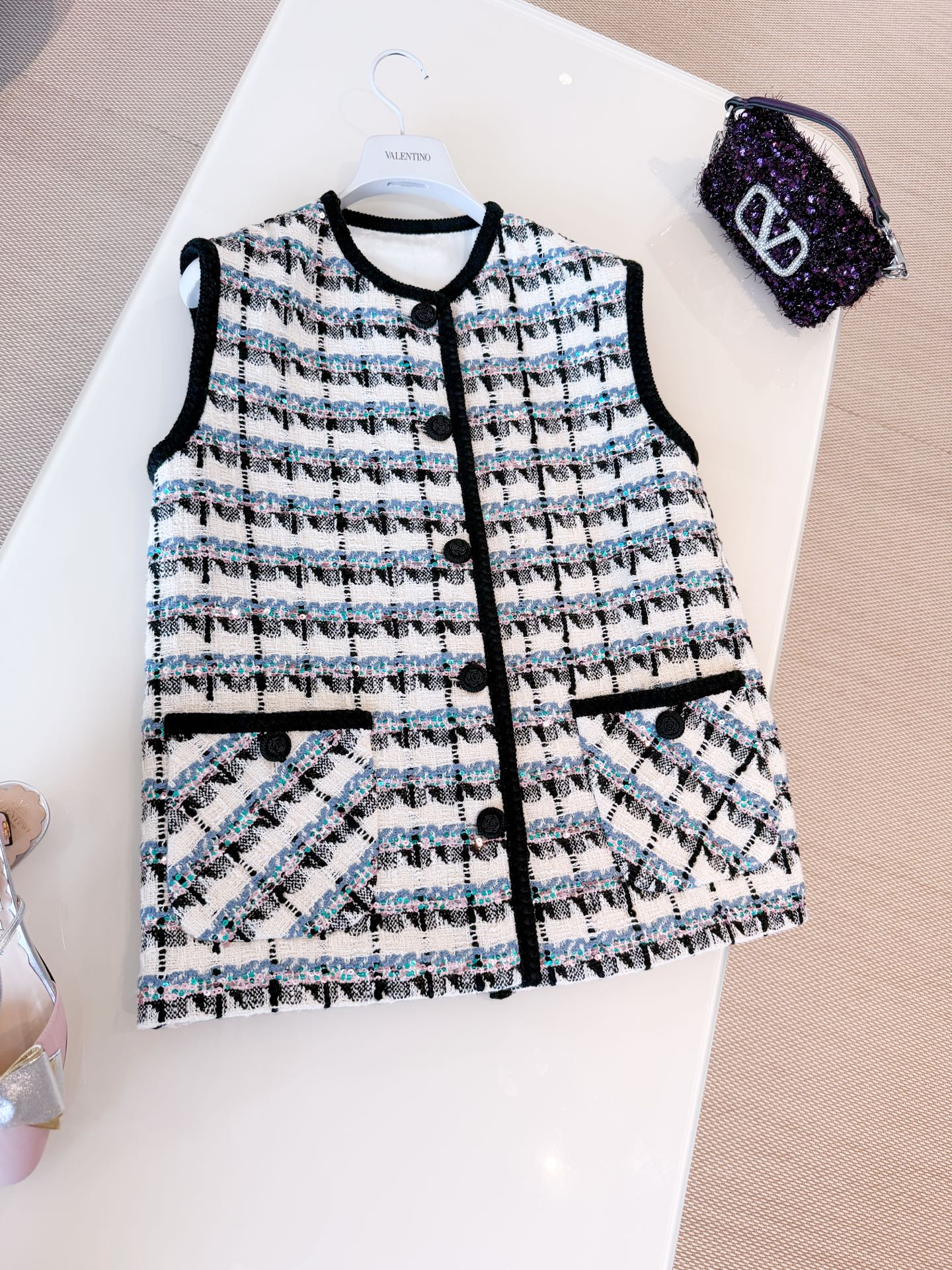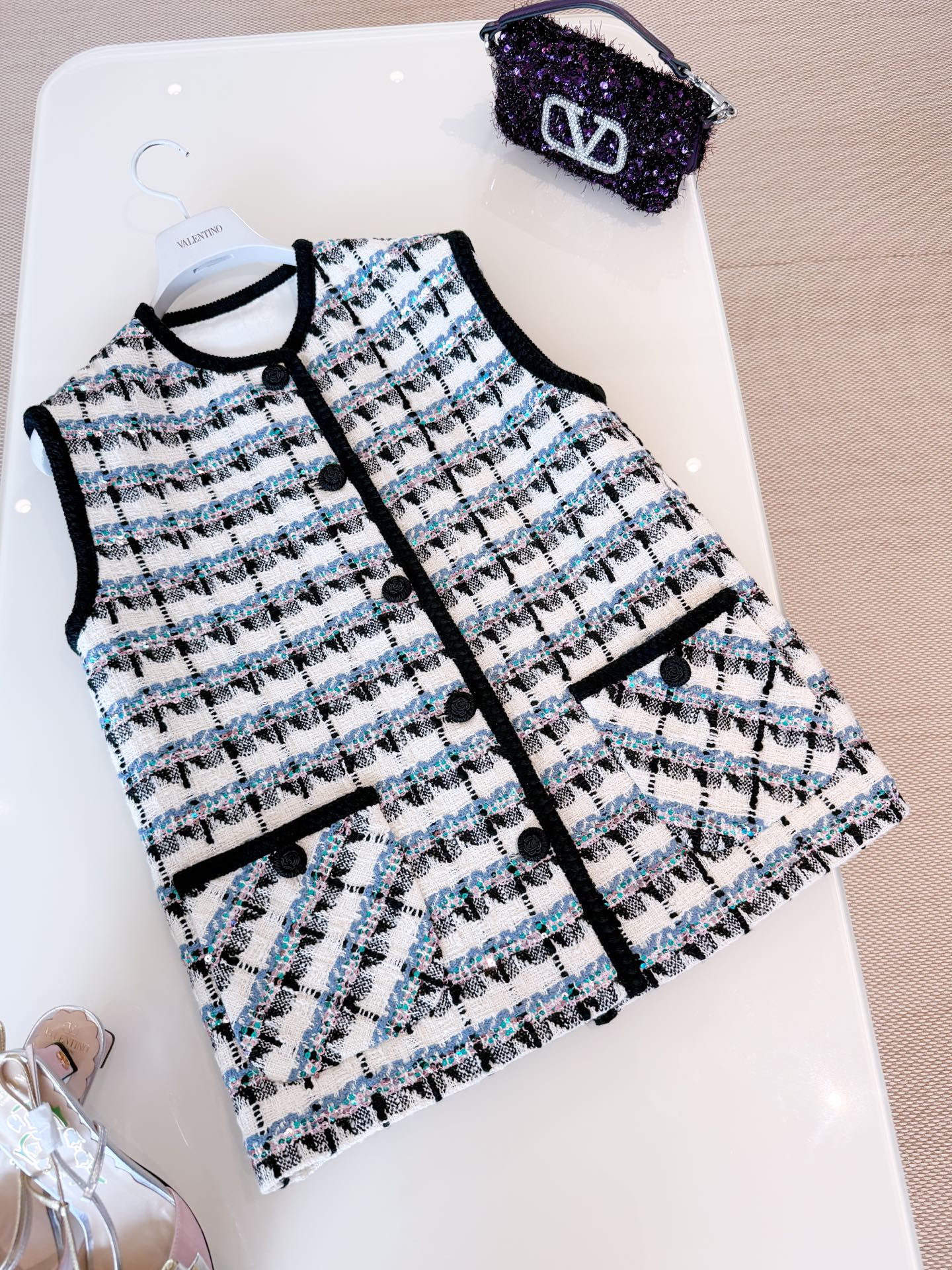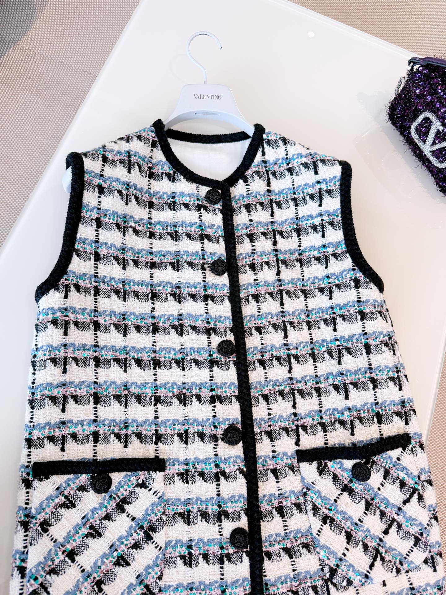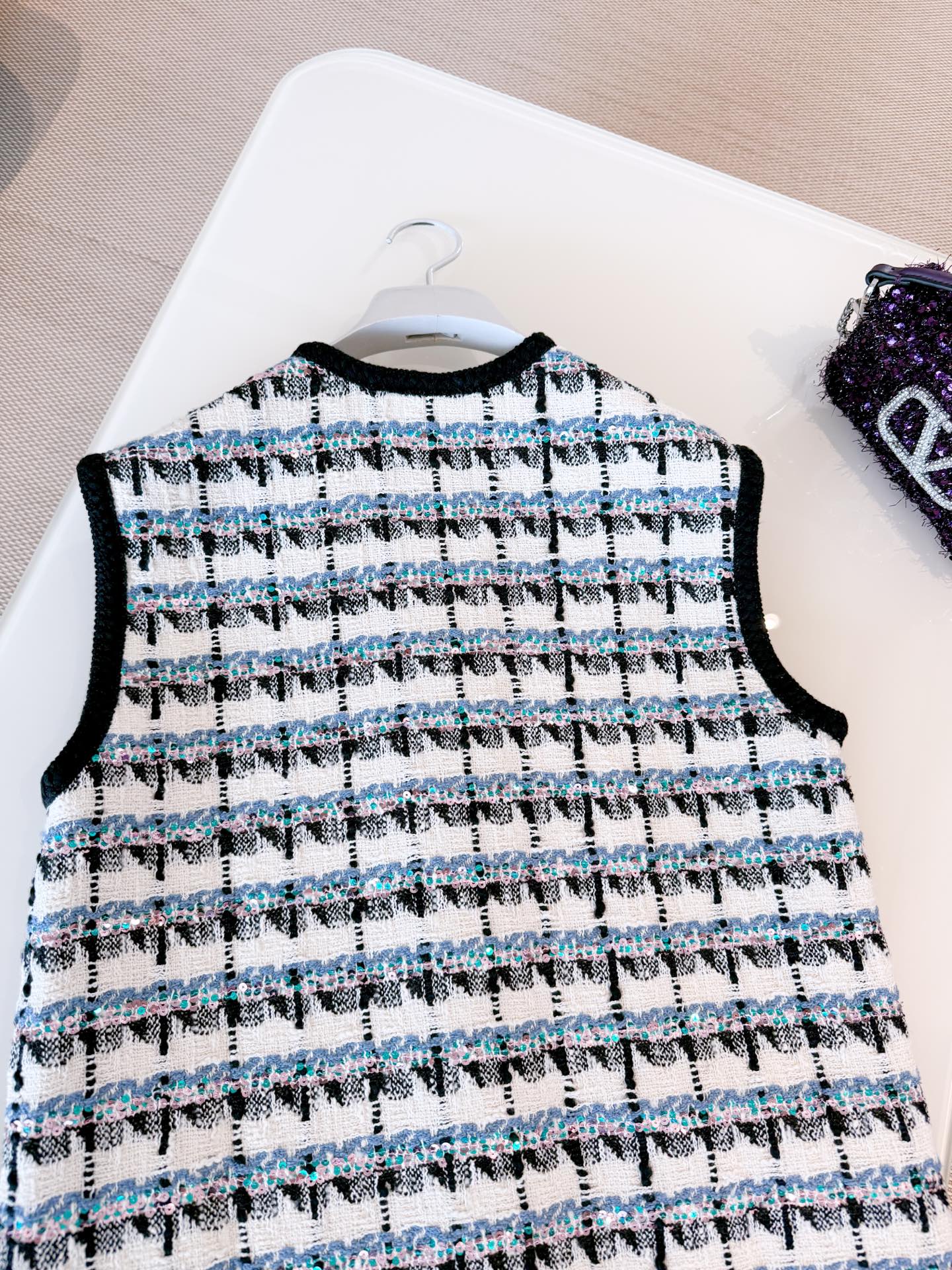 NIGO Valentino Women's Spring And Winter Tweed Sequins Check Pattern Solid Color Round Neck Single-Breasted Cotton Wool Blend Sleeveless Pocket Vest Ngvp #nigo2111