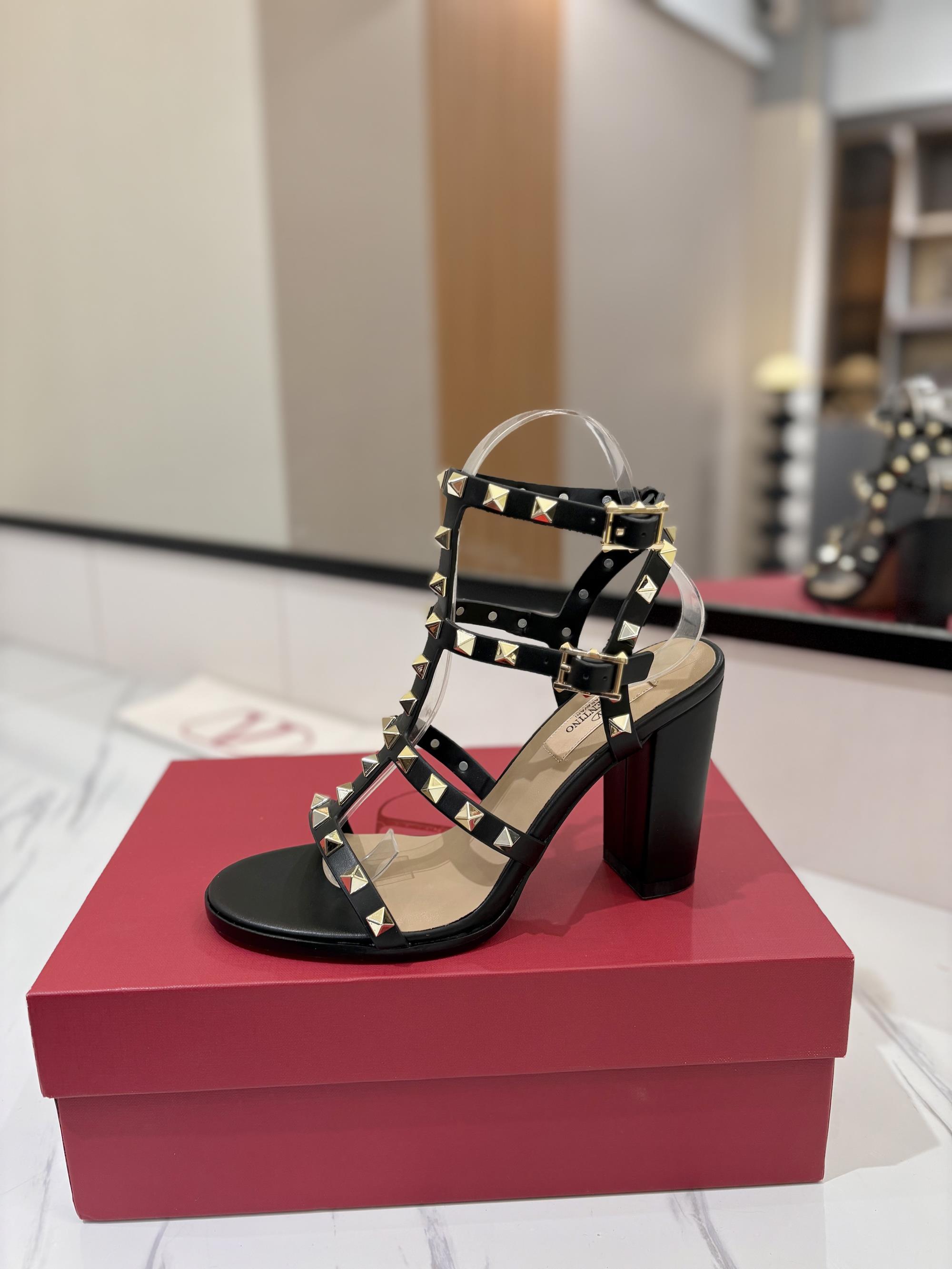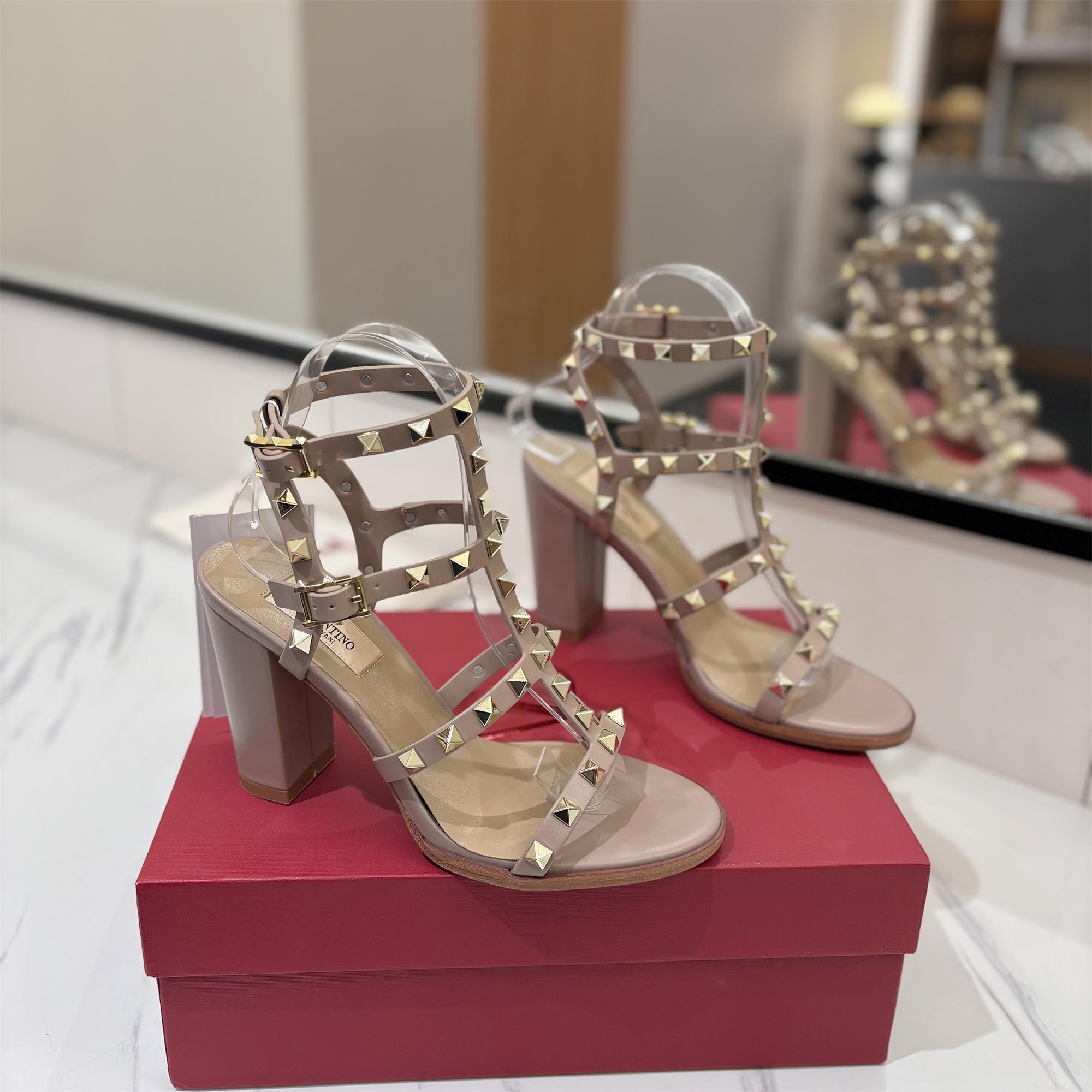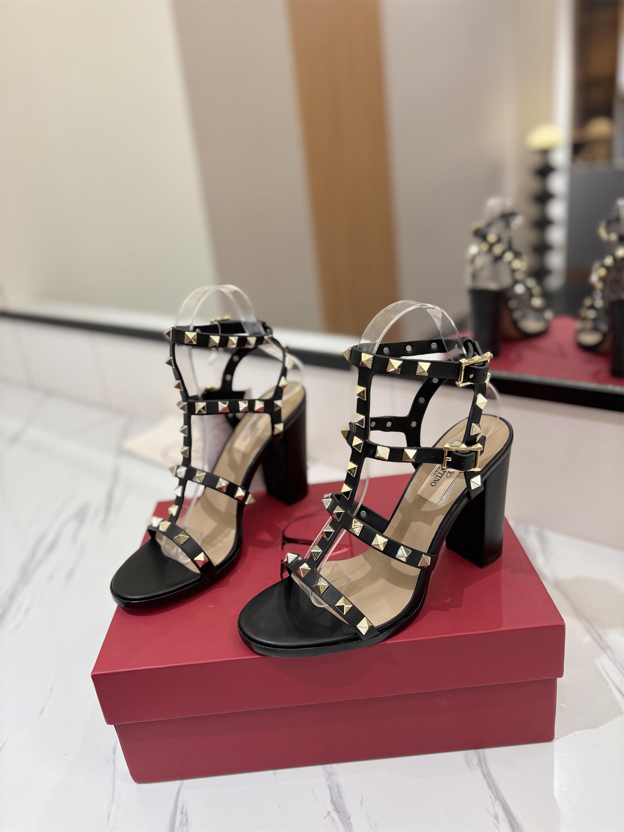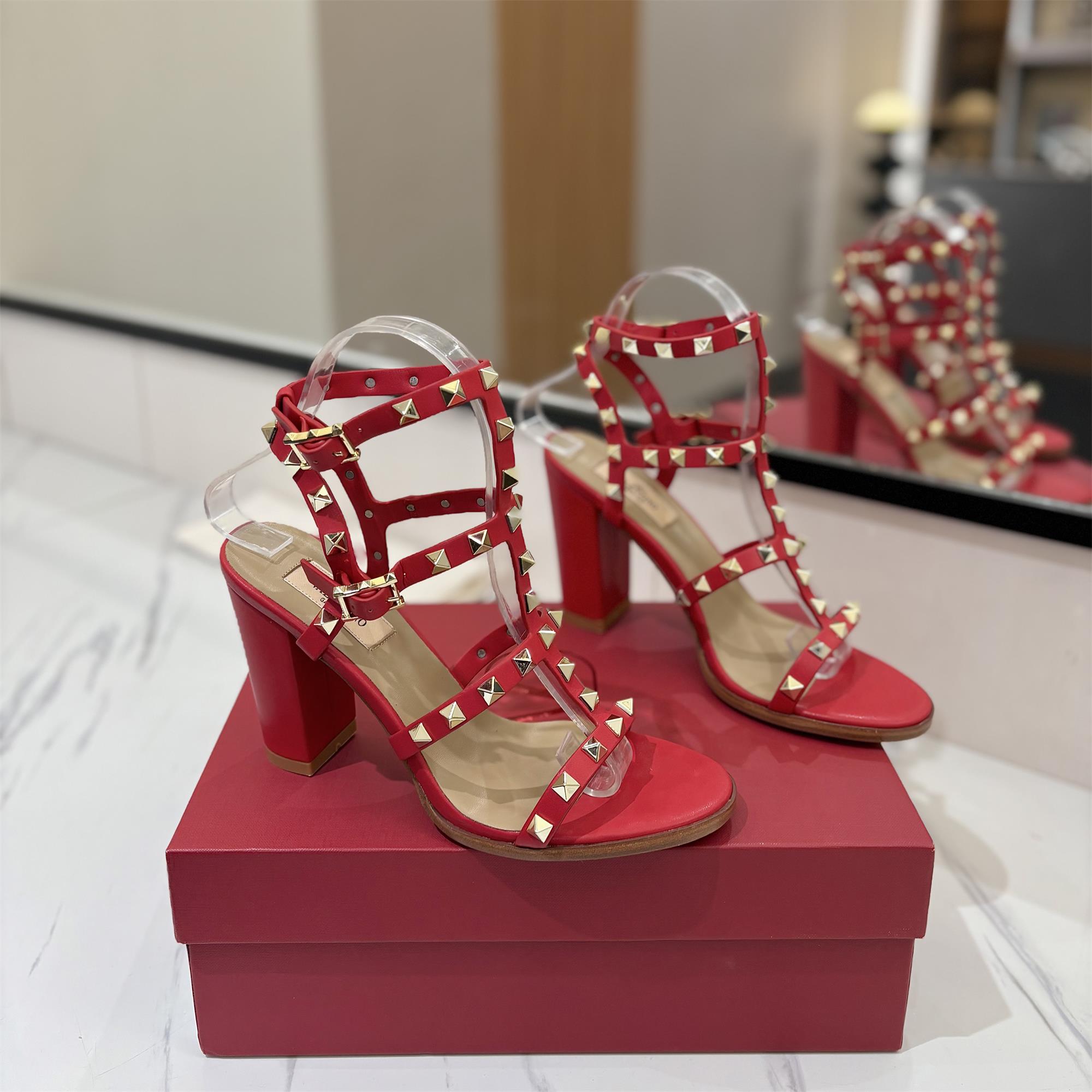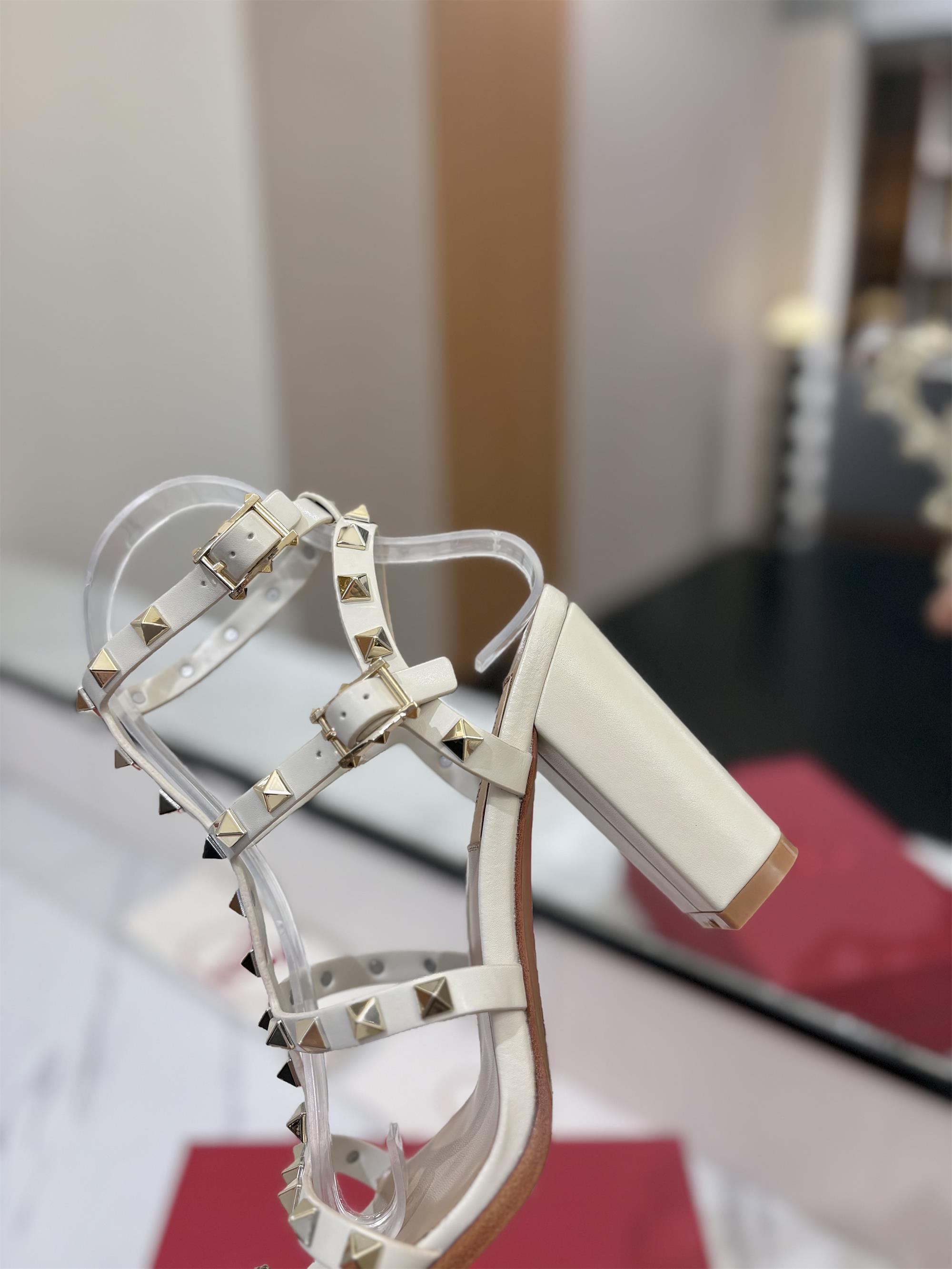 NIGO Valentino Women's Summer Solid Color Rivet Buckle 9cm Square Heel Sheepskin High Heels Shoes #nigo75829
