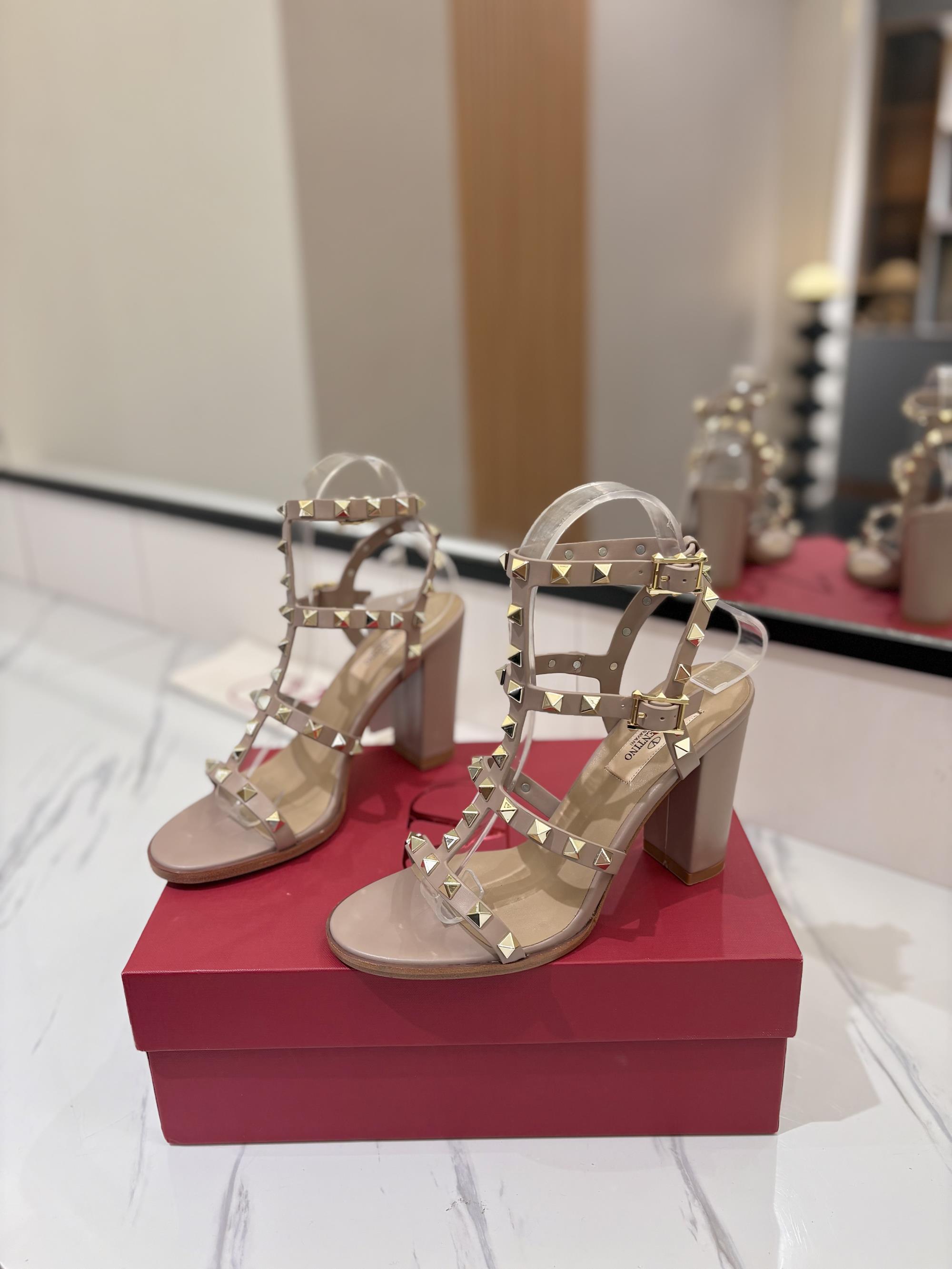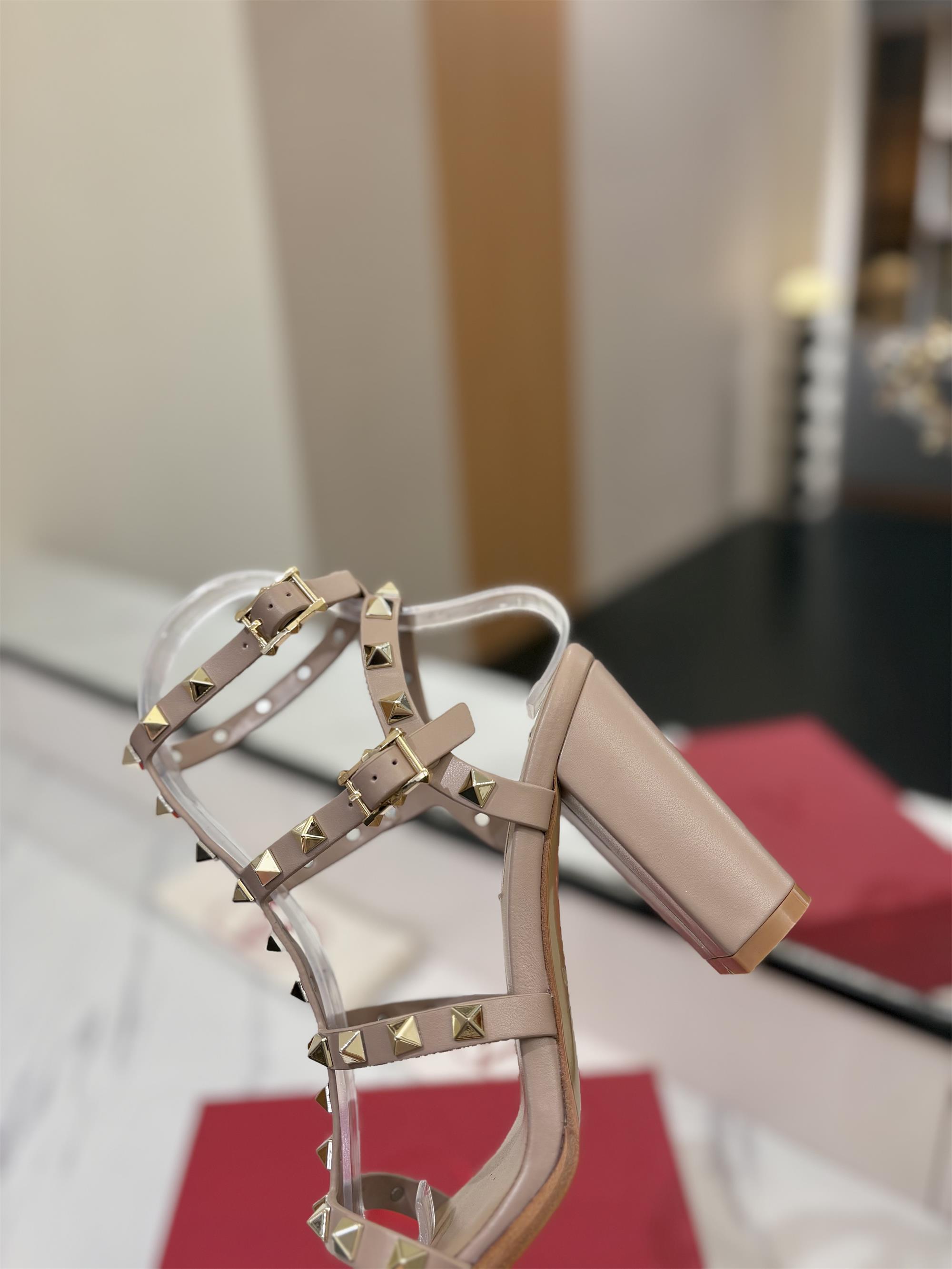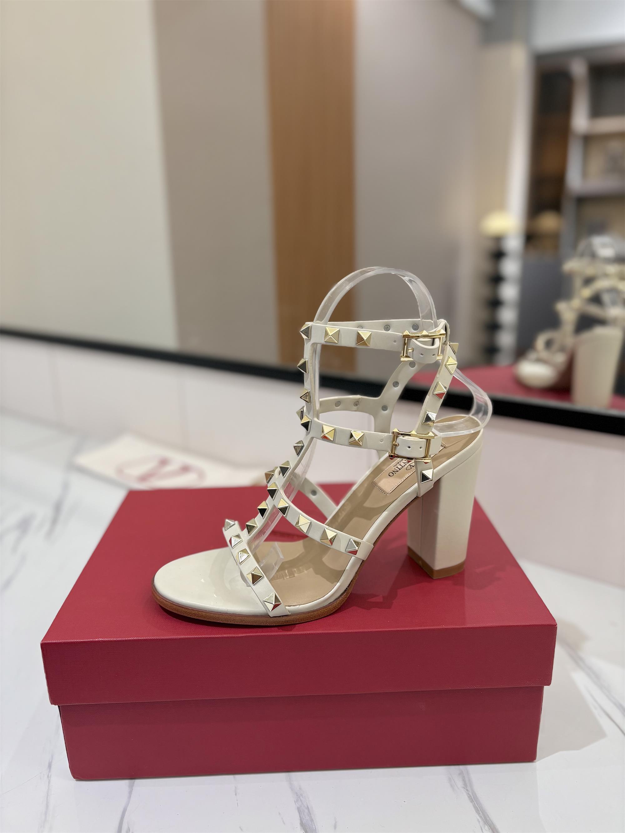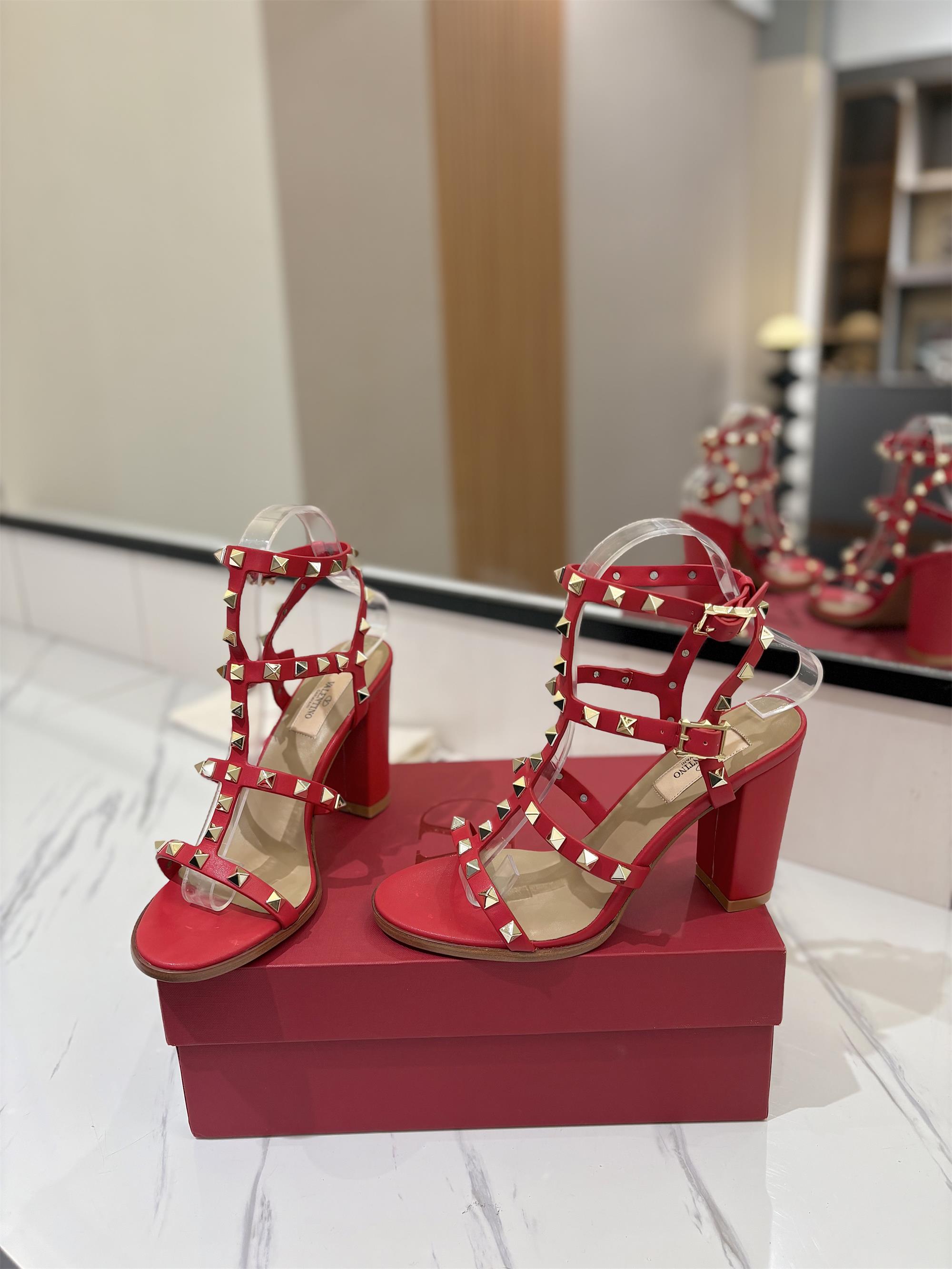 NIGO Valentino Women's Summer Solid Color Rivet Buckle 9cm Square Heel Sheepskin High Heels Shoes #nigo75829