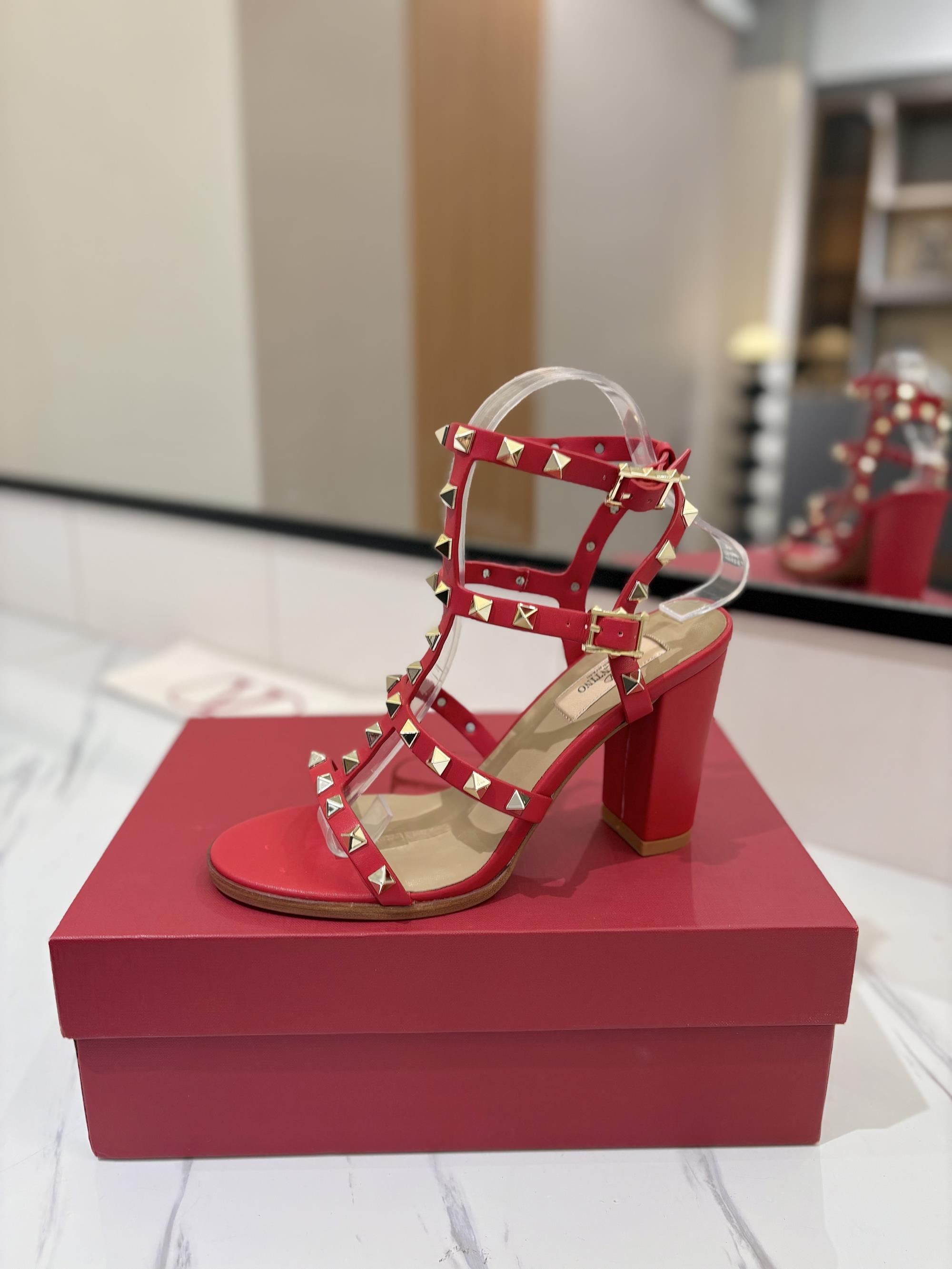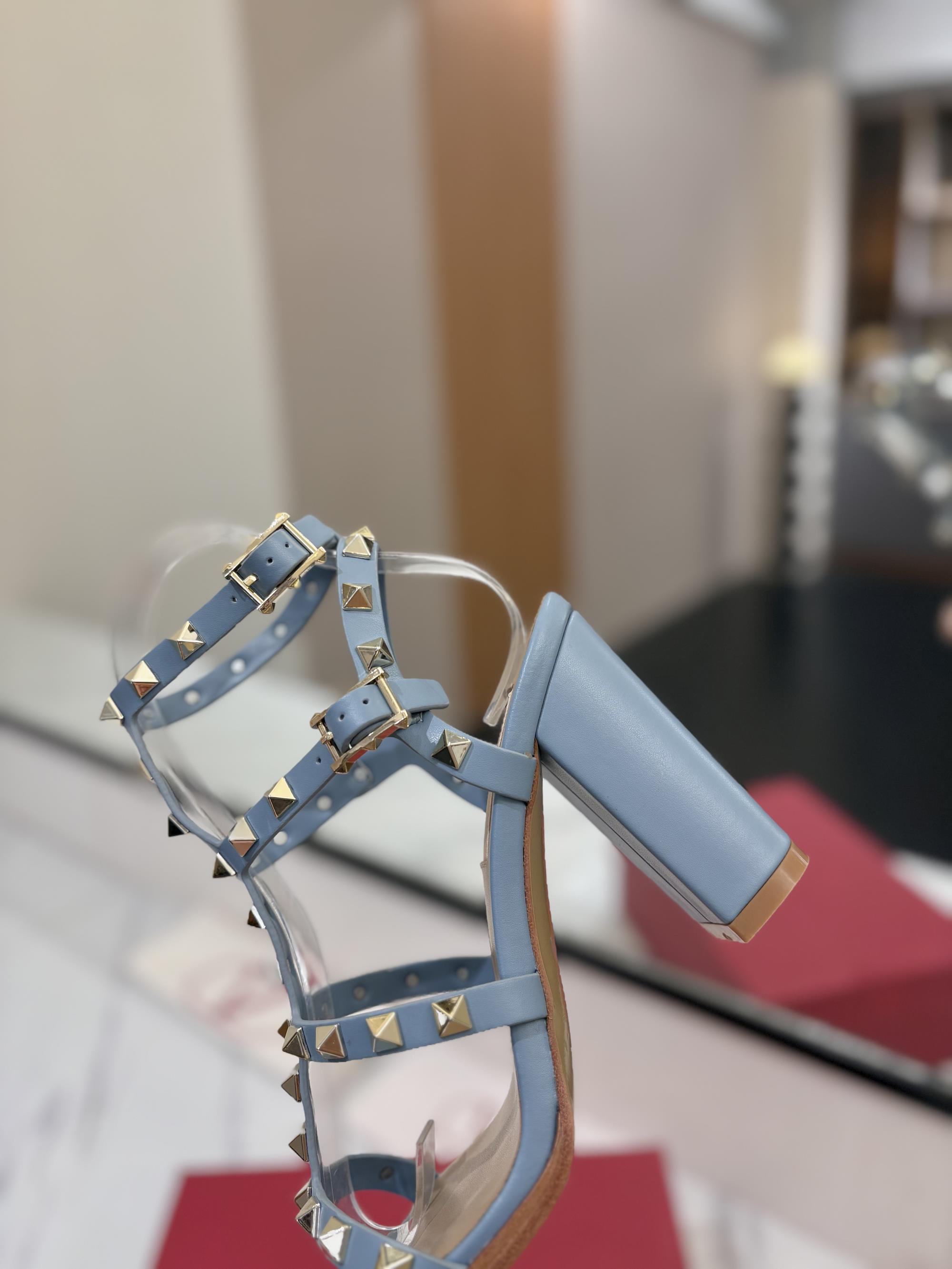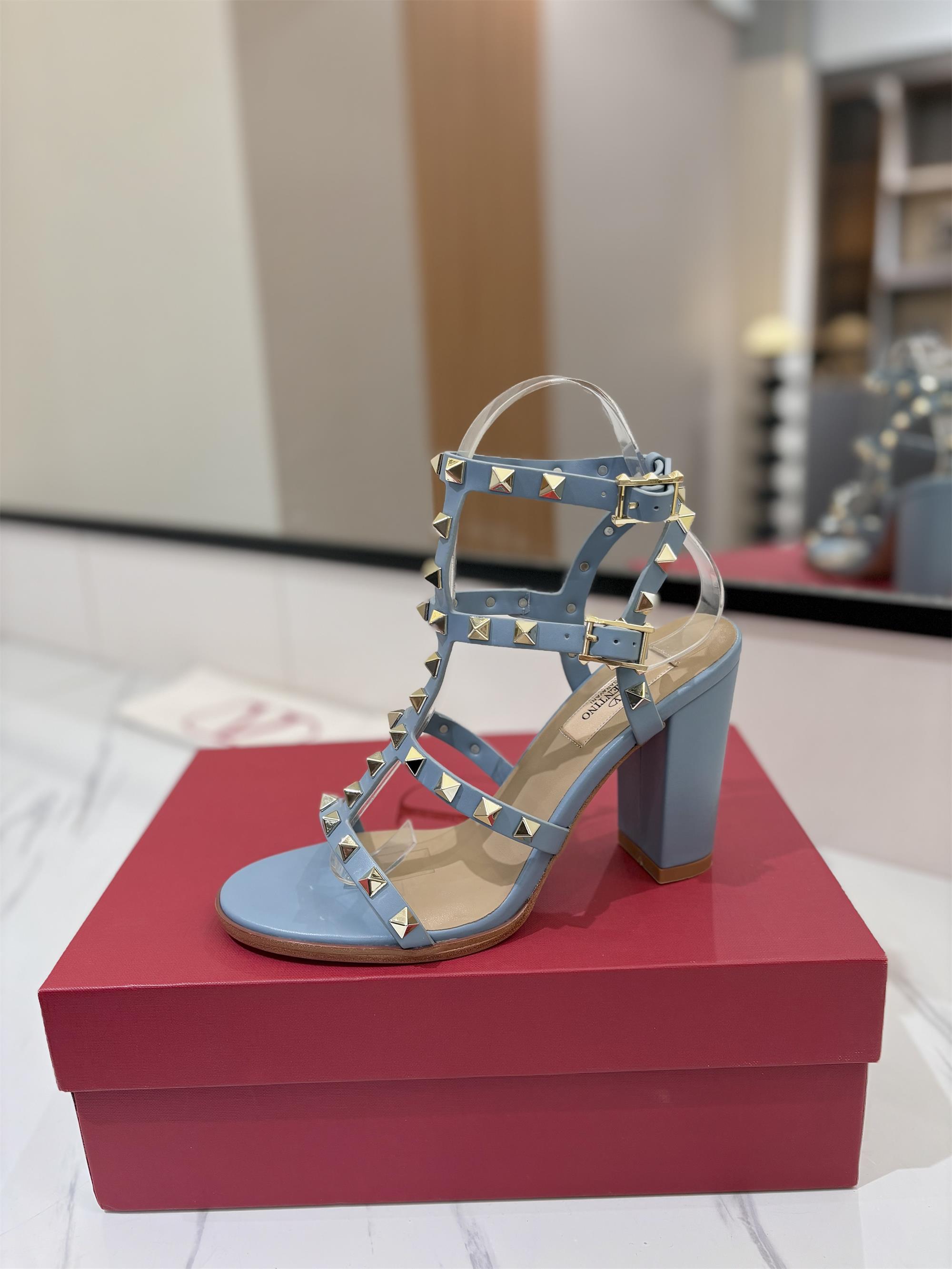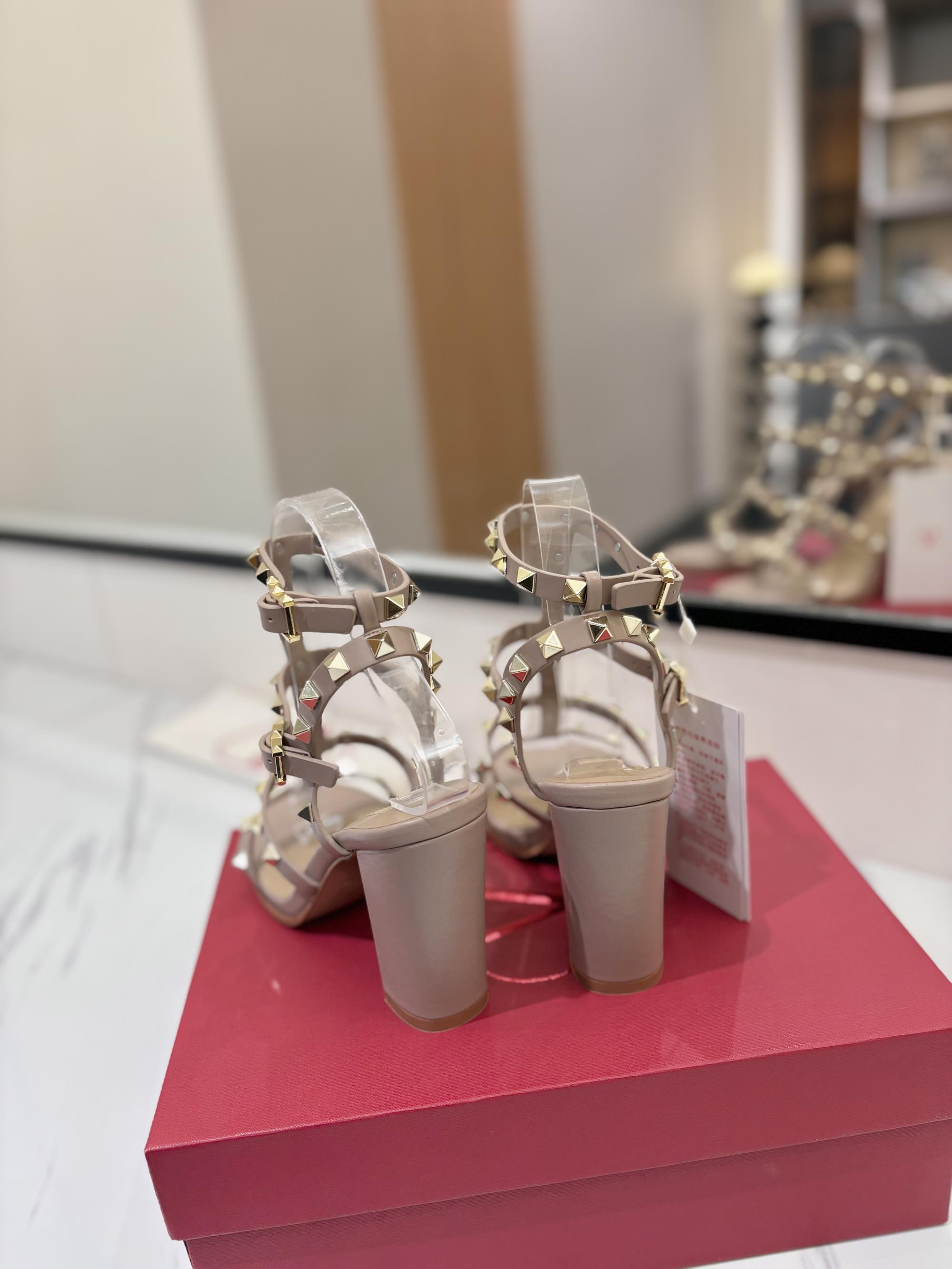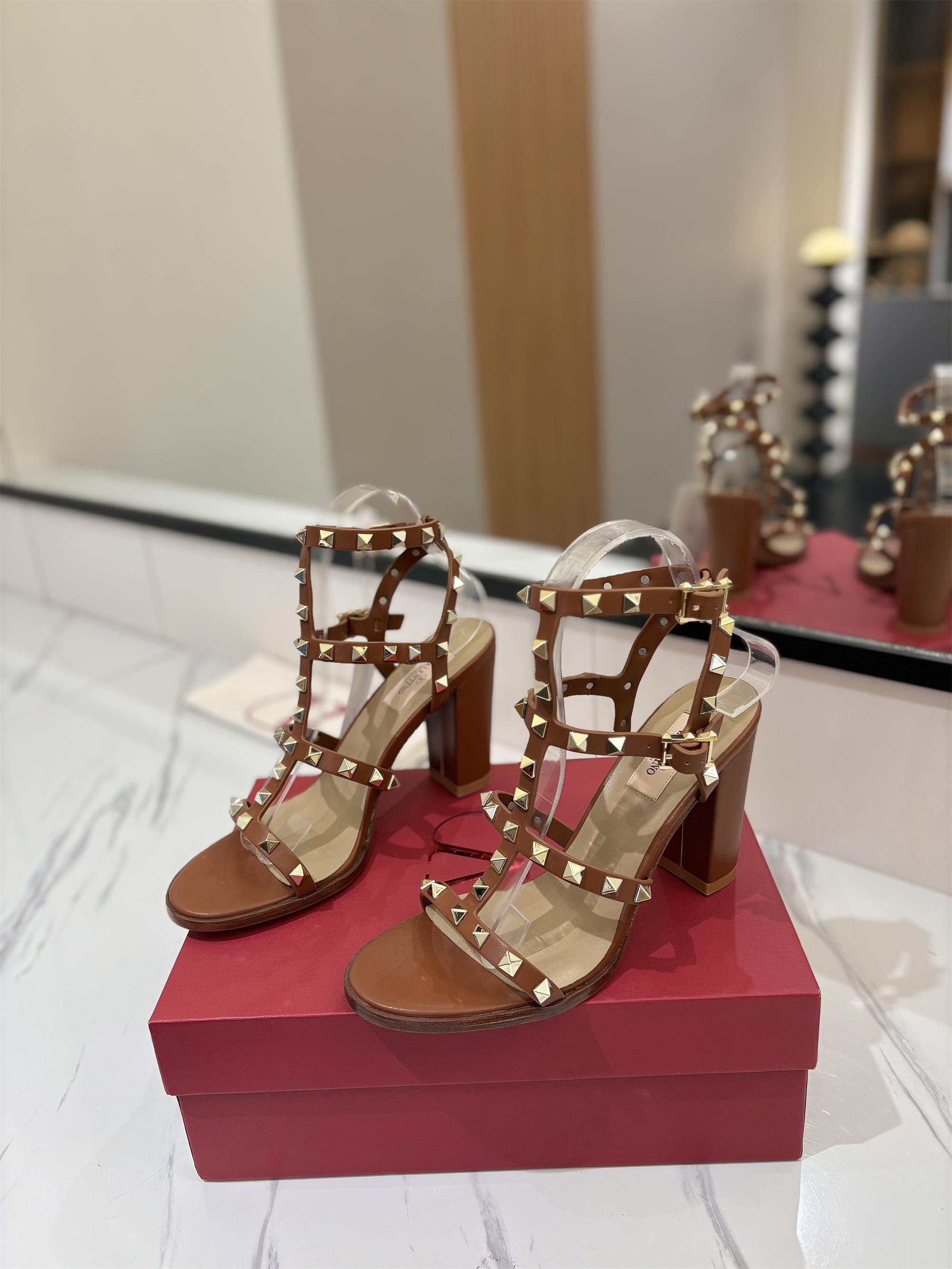 NIGO Valentino Women's Summer Solid Color Rivet Buckle 9cm Square Heel Sheepskin High Heels Shoes #nigo75829
