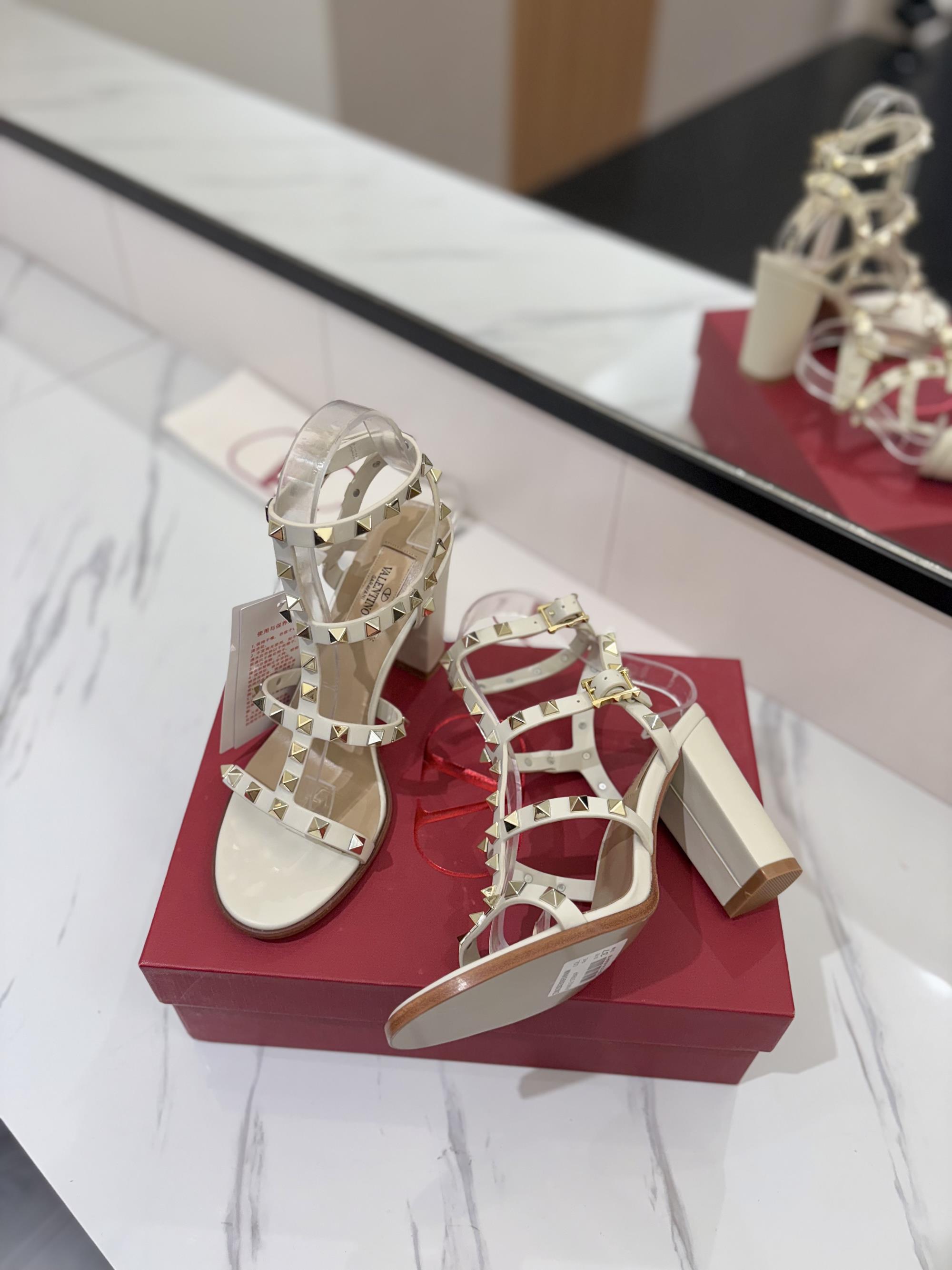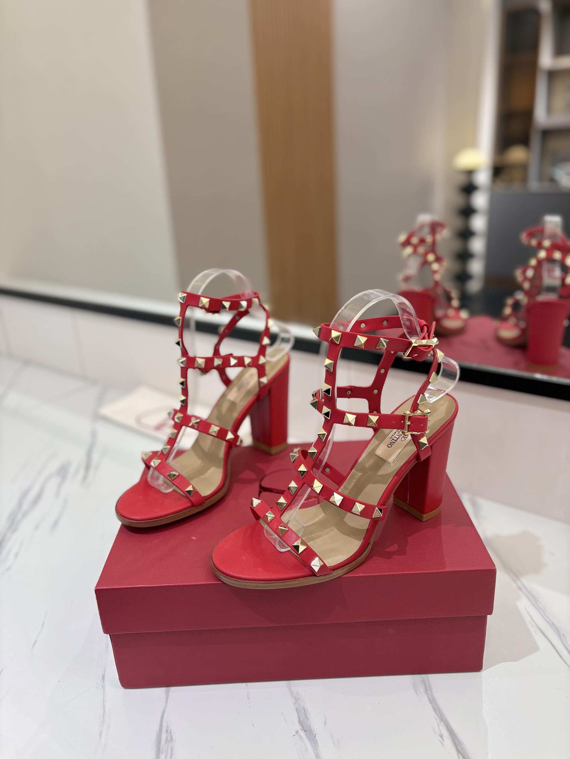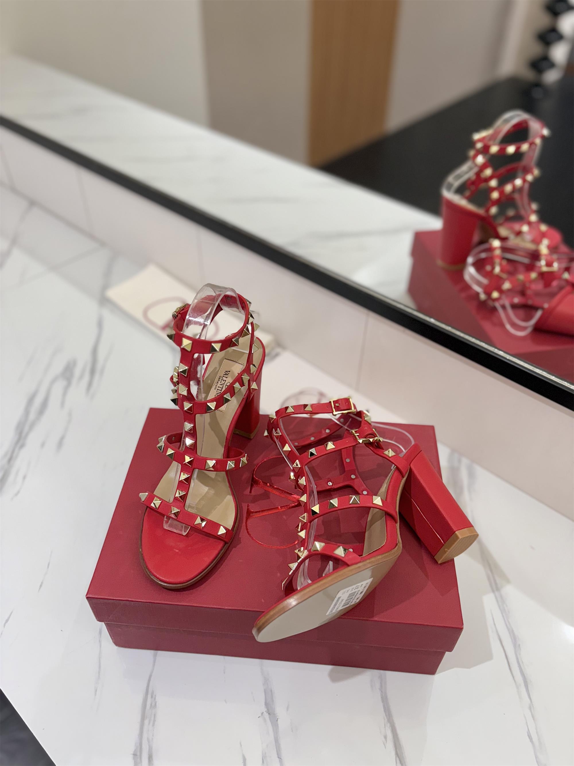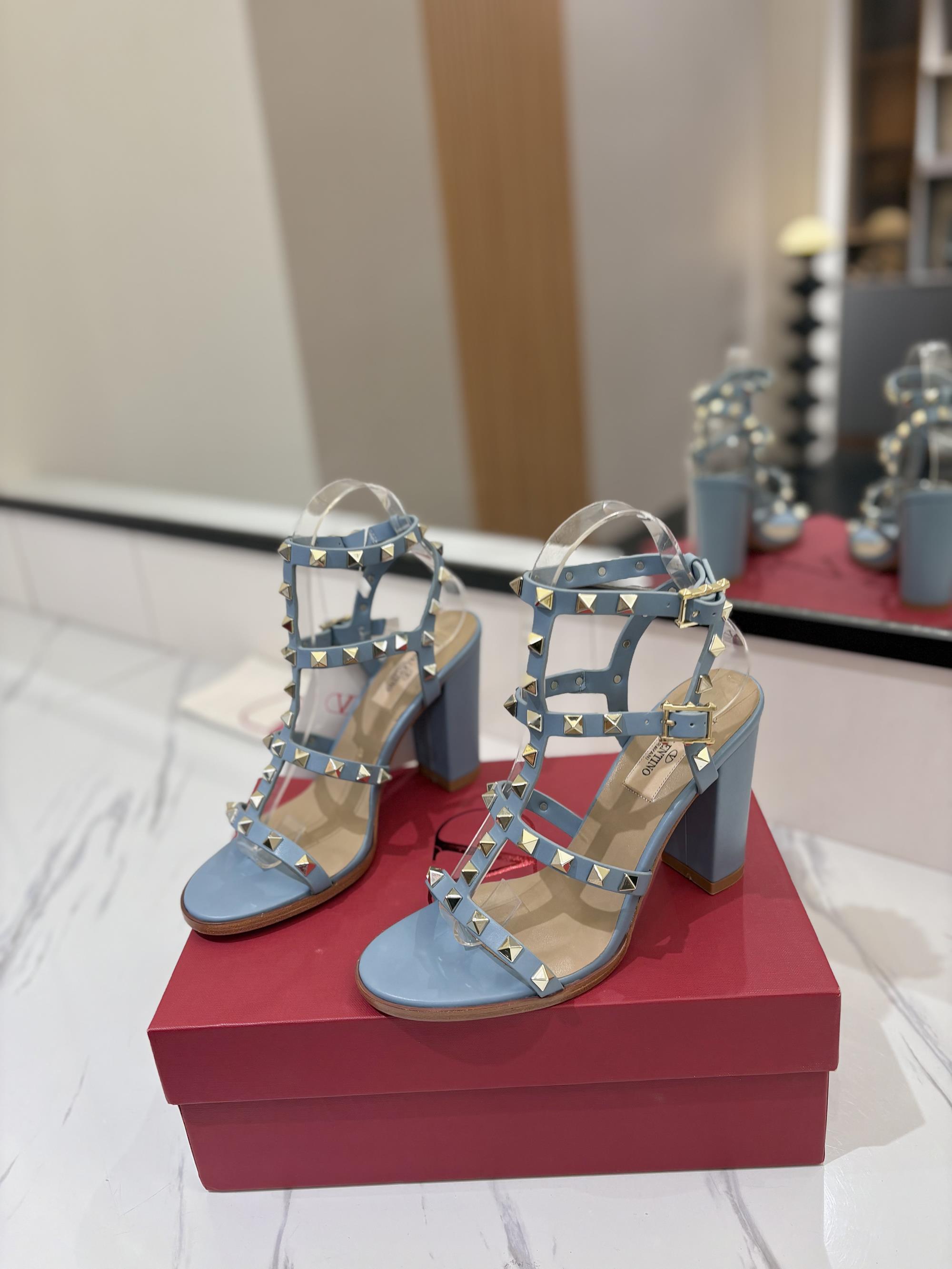 NIGO Valentino Women's Summer Solid Color Rivet Buckle 9cm Square Heel Sheepskin High Heels Shoes #nigo75829