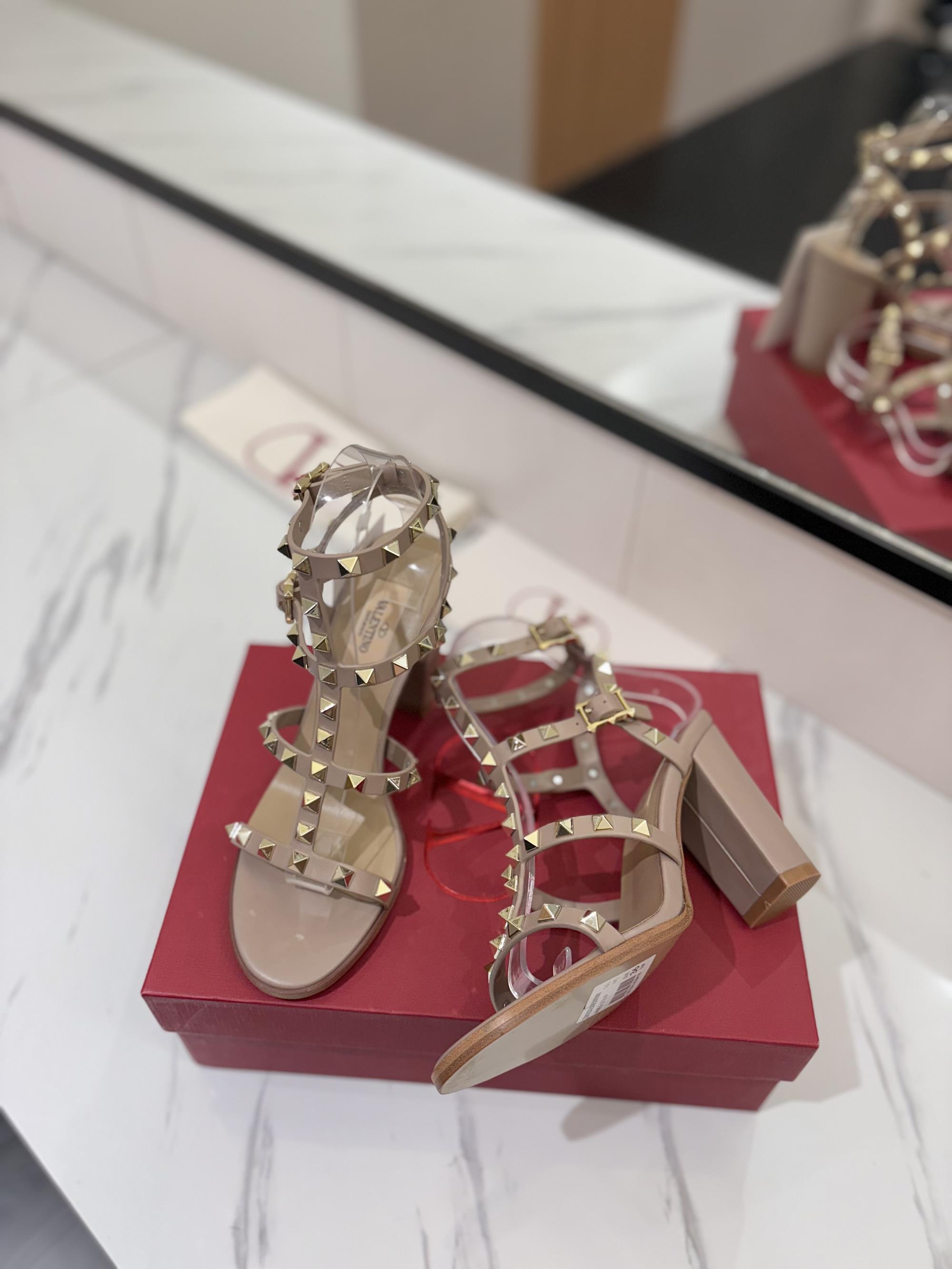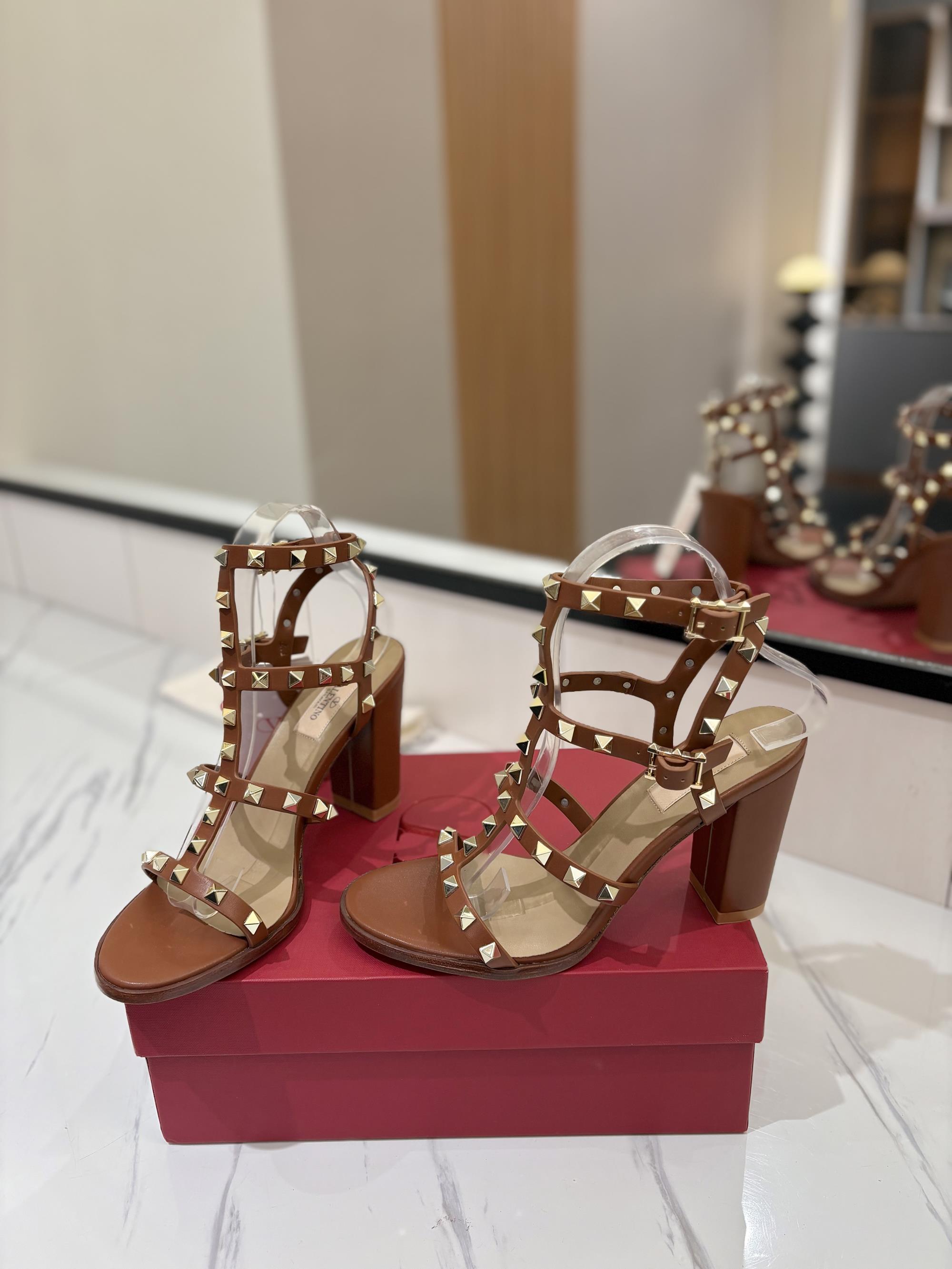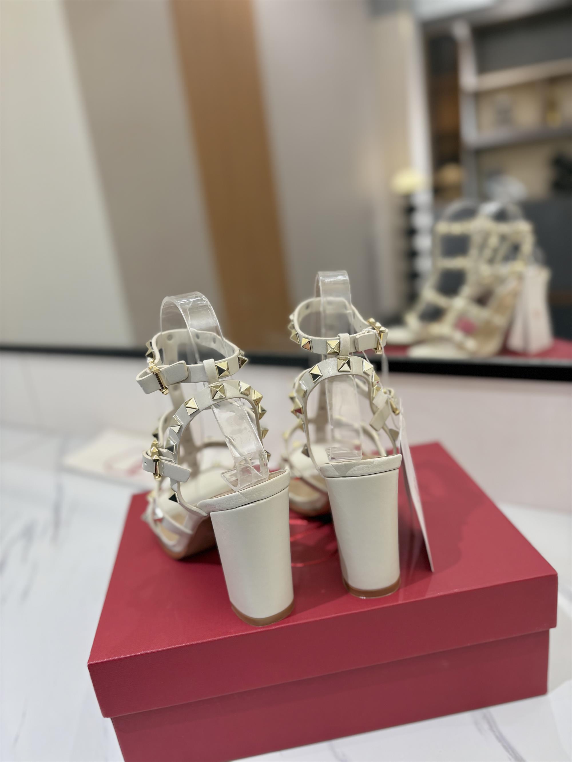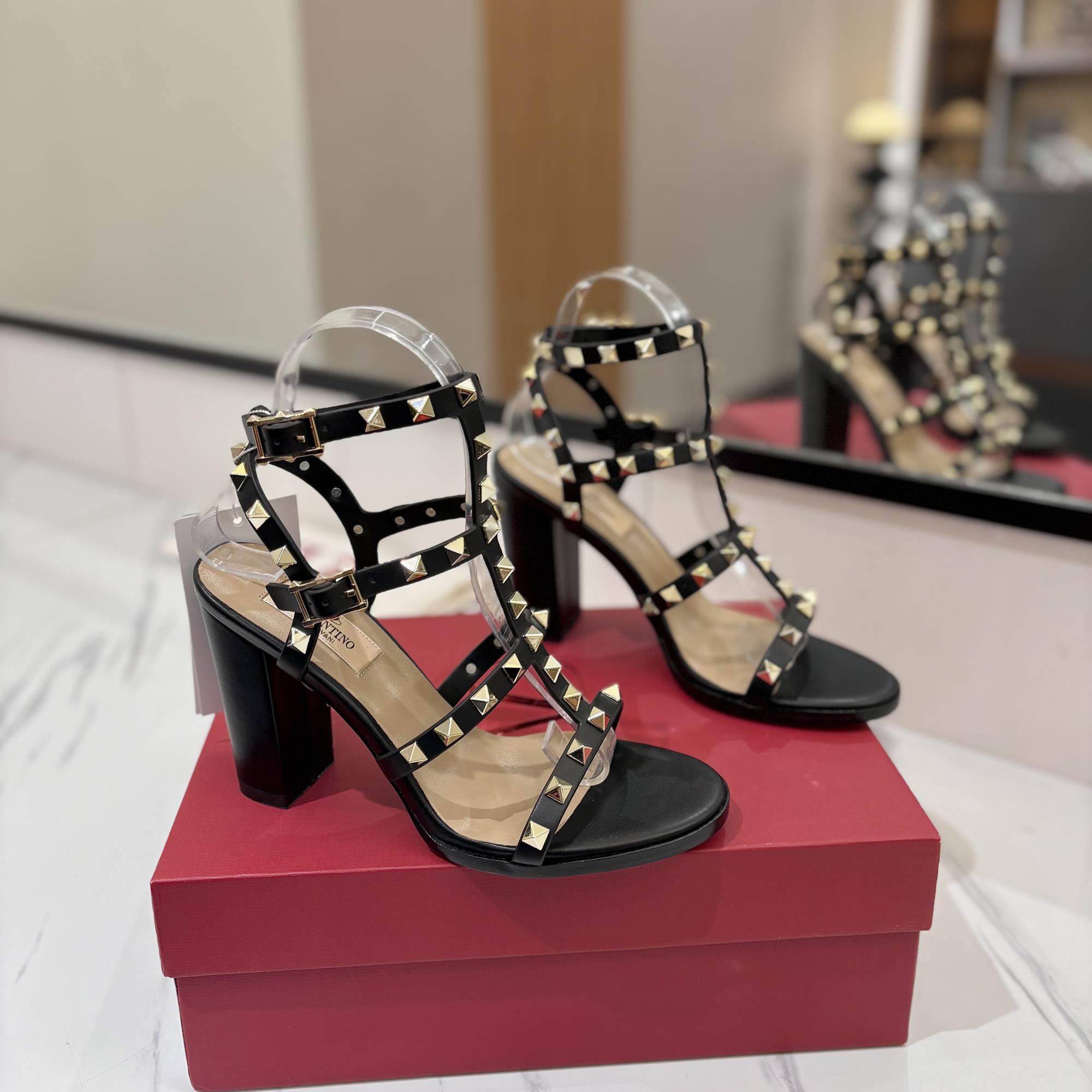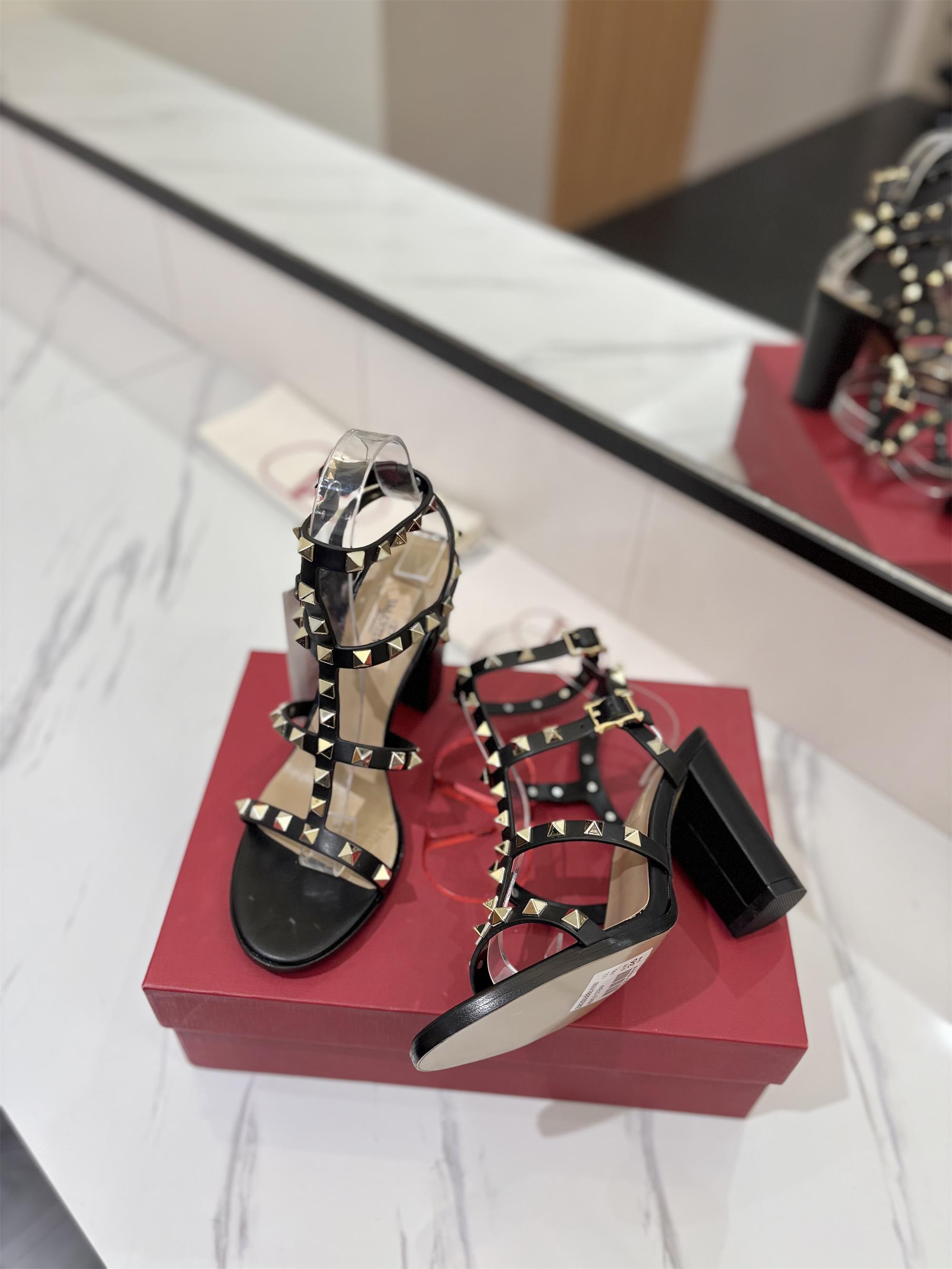 NIGO Valentino Women's Summer Solid Color Rivet Buckle 9cm Square Heel Sheepskin High Heels Shoes #nigo75829