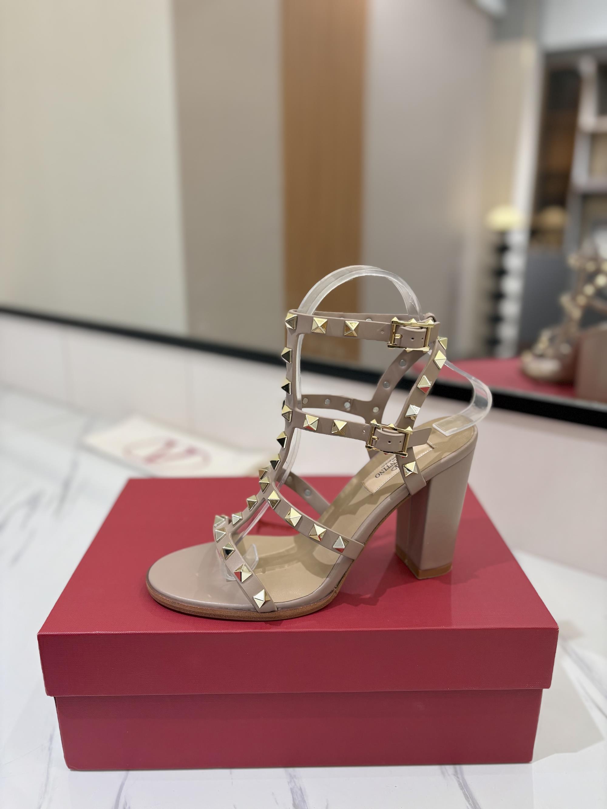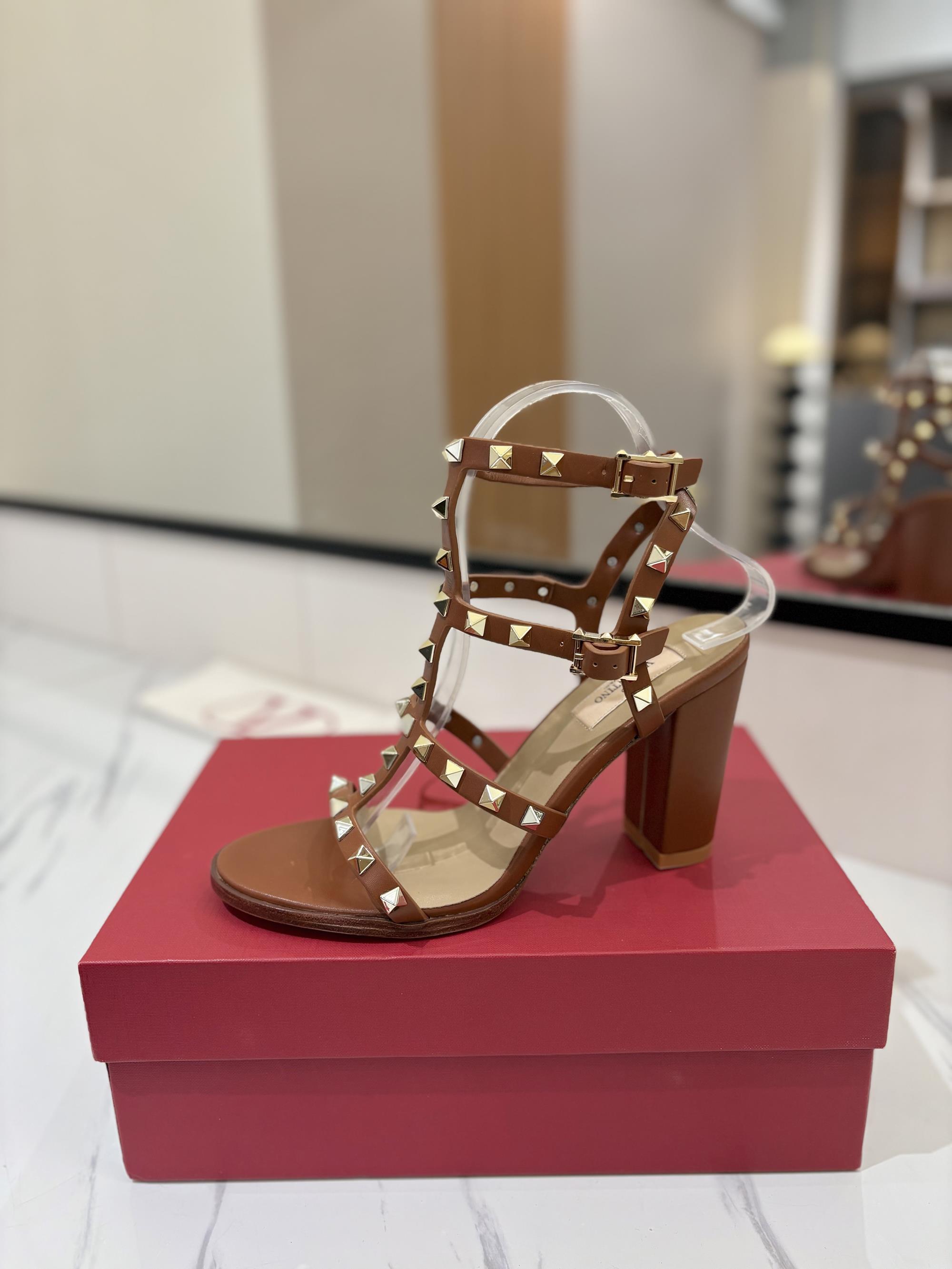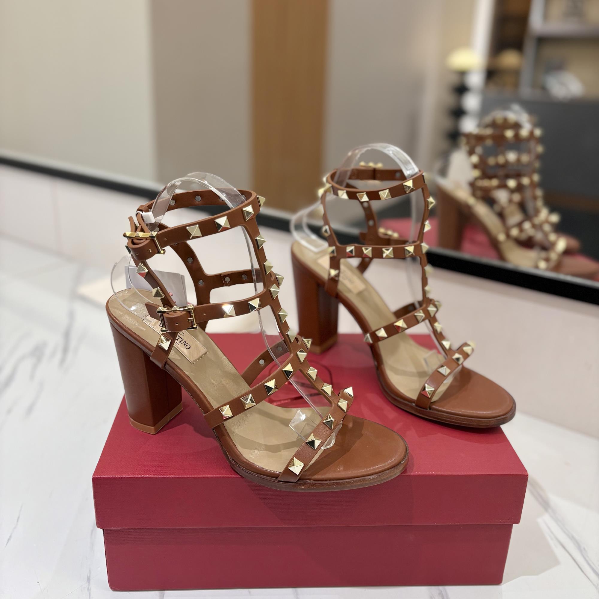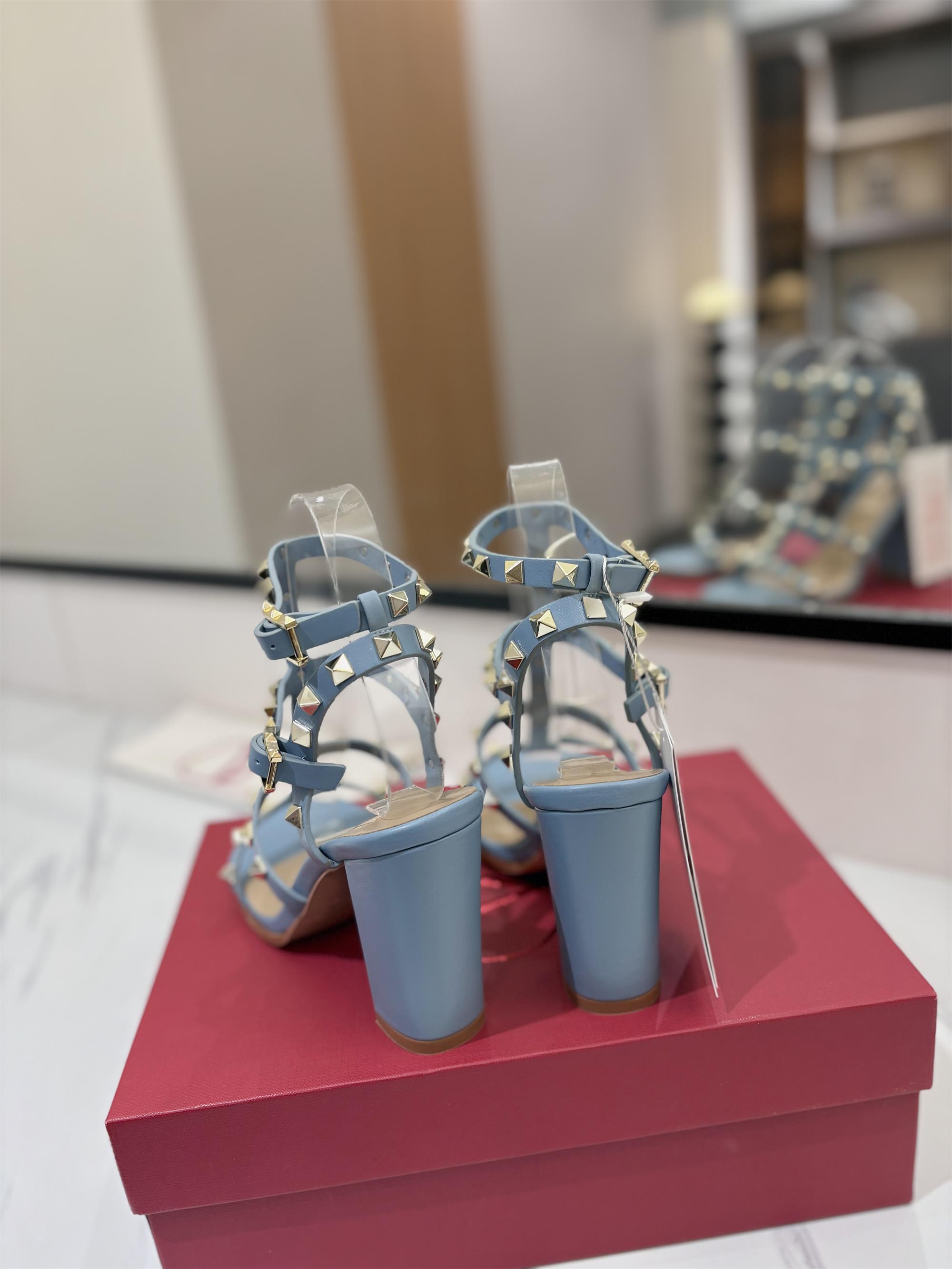 NIGO Valentino Women's Summer Solid Color Rivet Buckle 9cm Square Heel Sheepskin High Heels Shoes #nigo75829