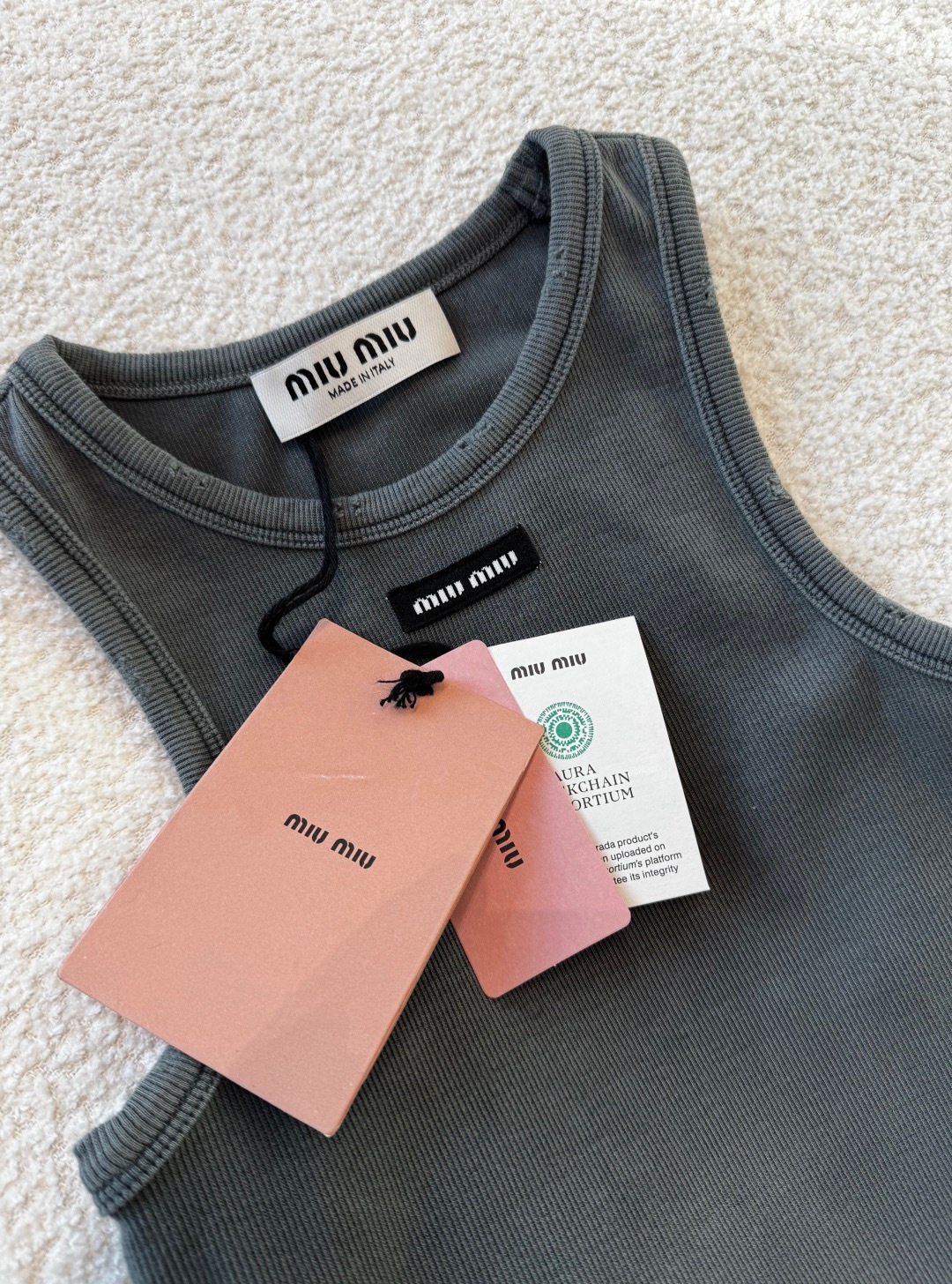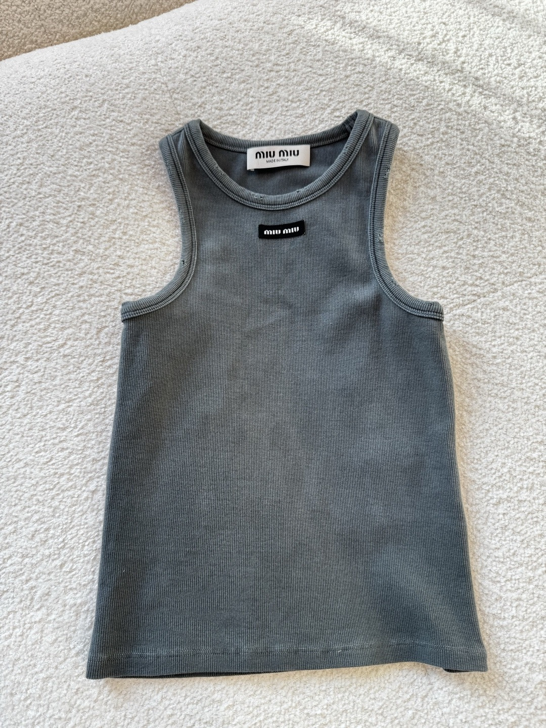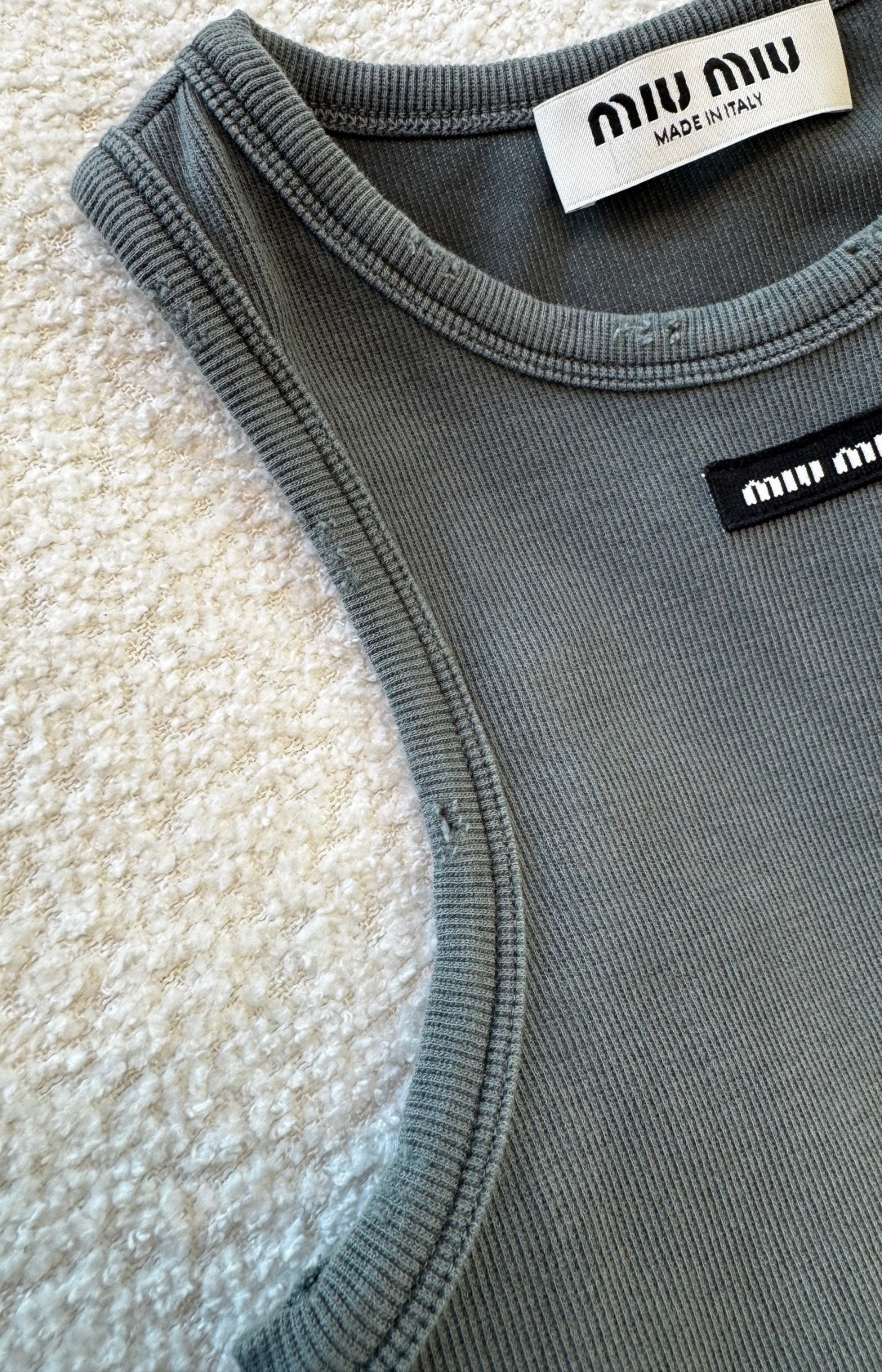 MIUMIU Women's Ribbed Knit Crew Neck Logo Patch Straight Tank Top #332263